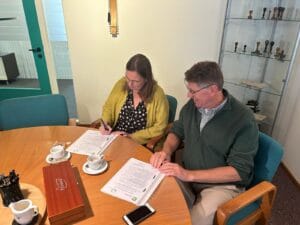 Wethouder Stefan Keijzerswaard en Peter Dijkstra ondertekenen de nieuwe samenwerkingsovereenkomst. Peter tekent als gelegenheidsvertegenwoordiger en coördinator van de Appelhof. Later zal het worden ondertekend voor de voorzitter en secretaris, die door overmacht niet aanwezig konden zijn.