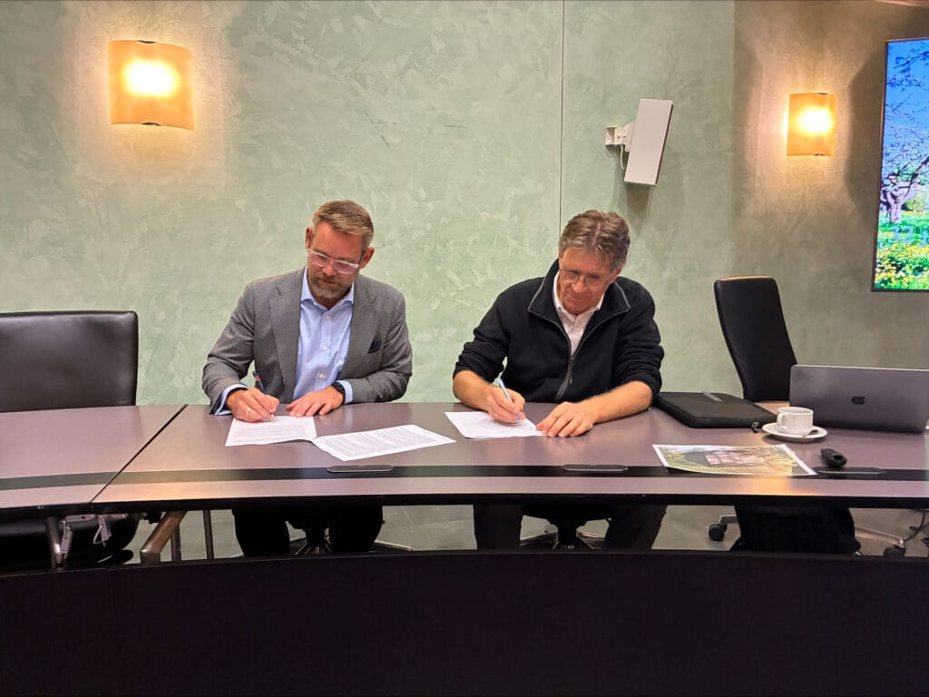 Wethouder Stefan Keijzerswaard en Peter Dijkstra ondertekenen de nieuwe samenwerkingsovereenkomst. Peter tekent als gelegenheidsvertegenwoordiger en coördinator van de Appelhof. Later zal het worden ondertekend voor de voorzitter en secretaris, die door overmacht niet aanwezig konden zijn.